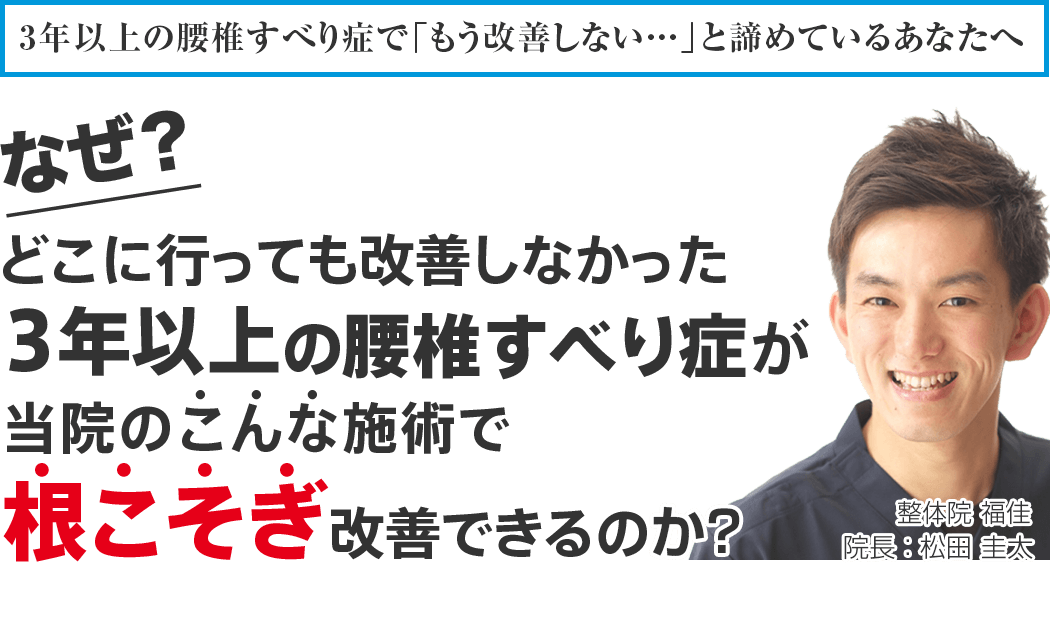 私は誰よりもあなたと向き合います。あなたの悩みを私に聞かせてください。あなたの慢性腰椎すべり症を改善するために全力で施術いたします。本気で慢性腰椎すべり症を改善したいと思われる方はいますぐお電話ください。